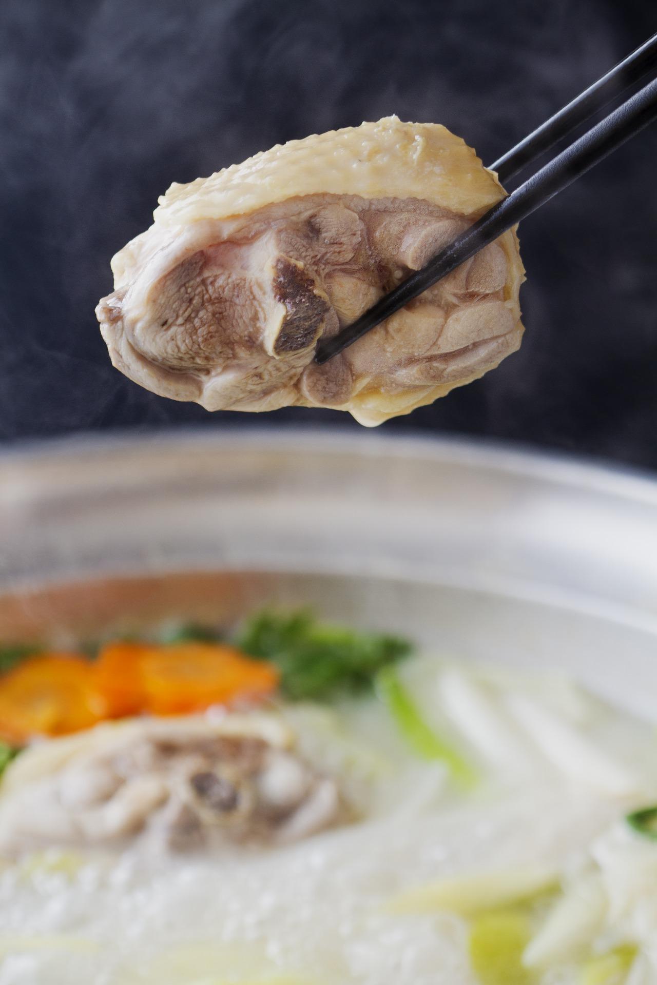 店主の目利きで厳選された若どり骨付きもも肉と鶏団子を使用し、鶏肉と具材の味を引き立てるオリジナル無添加スープをセットでご用意しています。