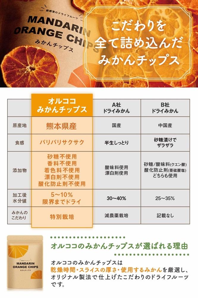 ●【添加物オールフリー】みかんの皮にはビタミンCや食物繊維が含まれ、栄養たっぷり。オルココのみかんチップスはみかんをまるごとスライスし、栄養素を逃さないようにゆっくり時間をかけて限界までドライ乾燥しています。無添加と砂糖不使用で、子供のおやつやダイエット中の方も安心してお召し上がりいただけます。