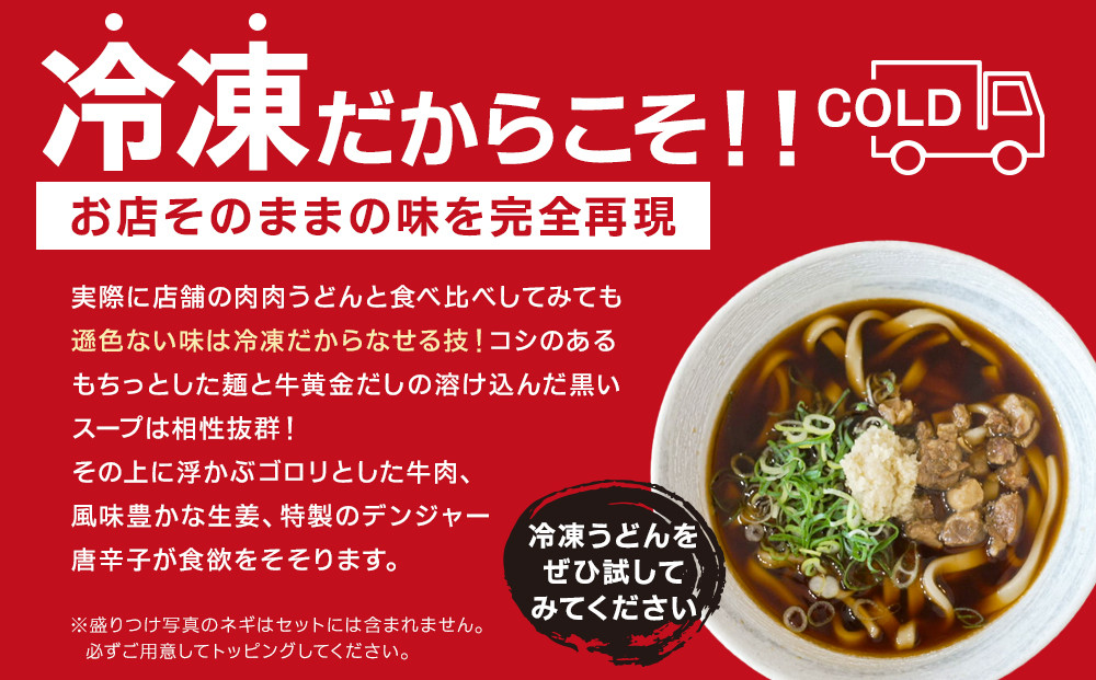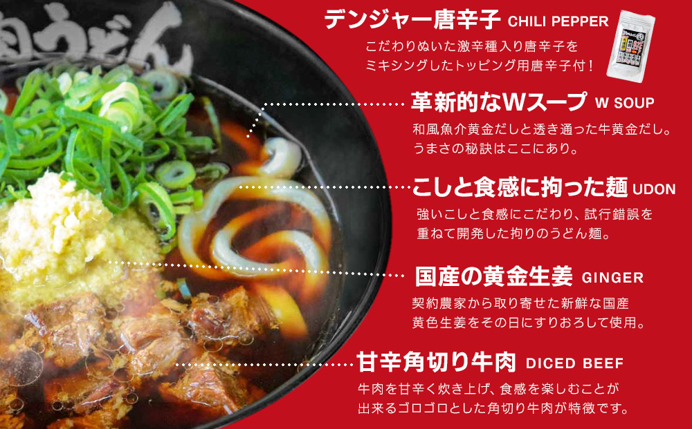 生姜、デンジャー唐辛子もセットにしており、ネギだけを準備頂ければ肉肉うどんが完成します。