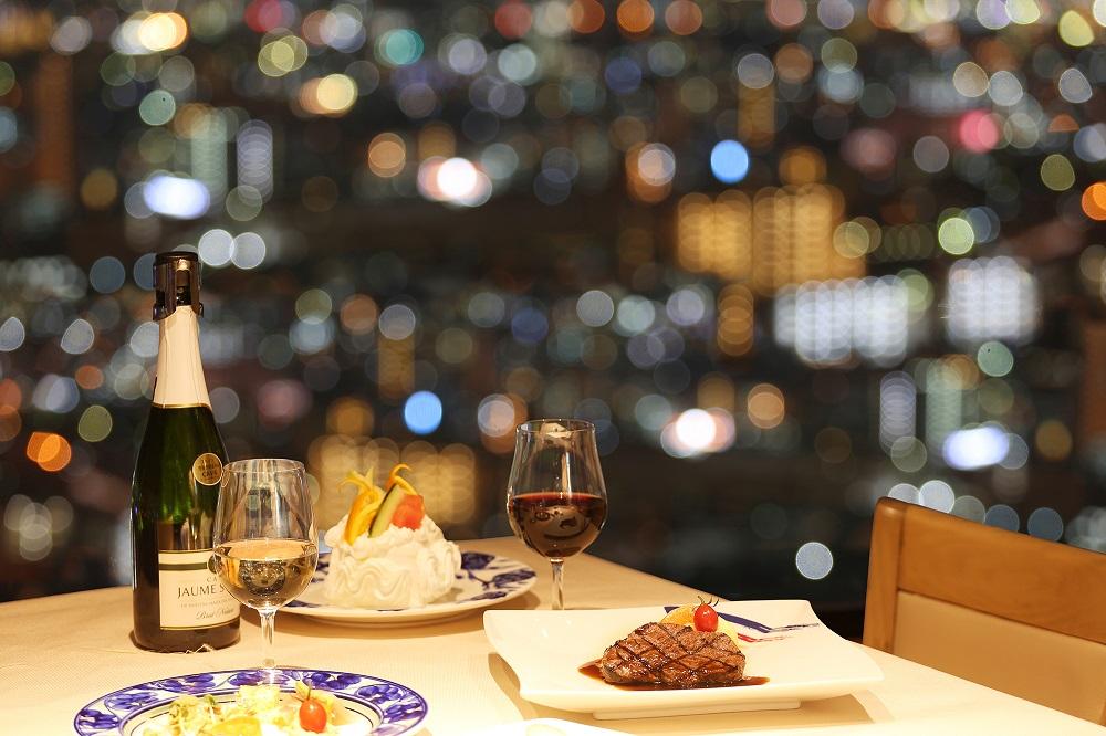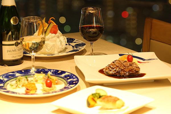 福岡タワー内展望レストランにて、地上120mの眺望より星屑を散りばめた様な絶景を見ながらフルコースディナーをお召上がり頂けます。