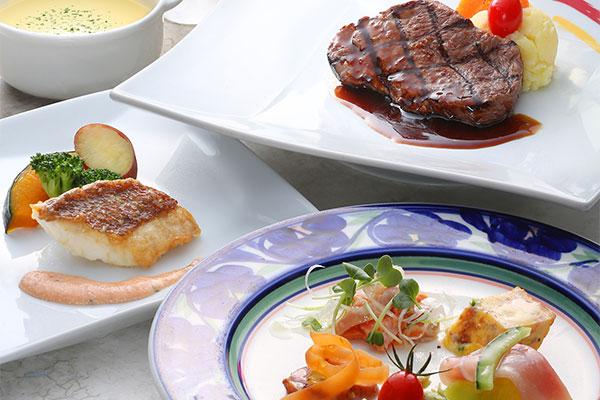 季節の野菜をふんだんに使用した前菜5種盛からお魚料理や国産牛ロースステーキ和風ソース、デザートはご希望で記念日を演出するデコレーションケーキに20文字程度でメッセージをお入れ致します。