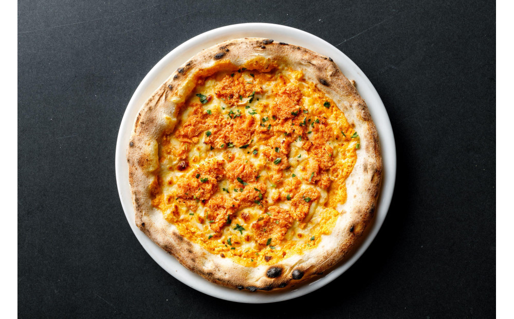 明太マヨピザは、博多を代表する名物ピザ。着色料不使用の明太子。ピリッとしたほどよい辛さがクセになるピザ。