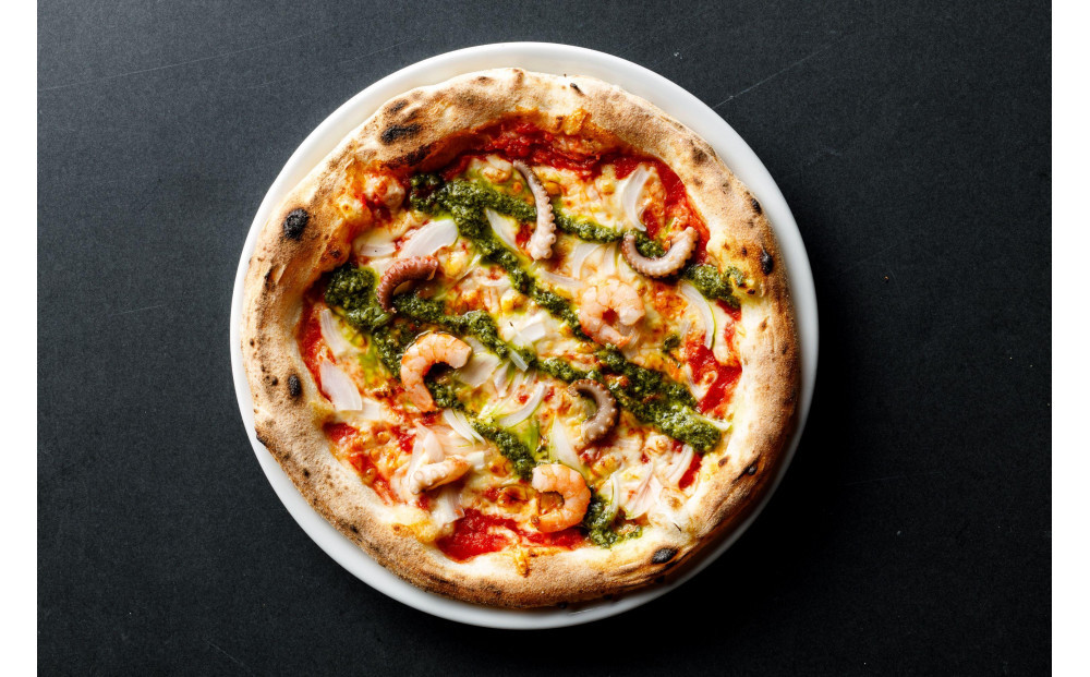 海鮮トマトバジルは、トマトの旨味と魚介の旨味の相乗効果を感じられる、ピザレボ定番の大人気ピザ。