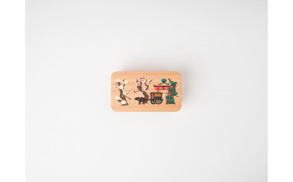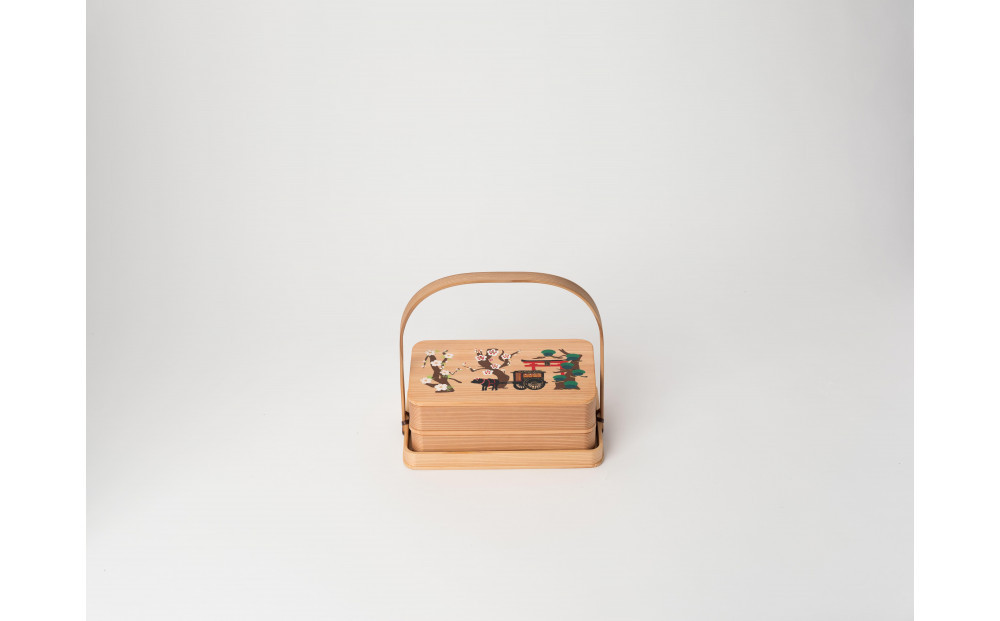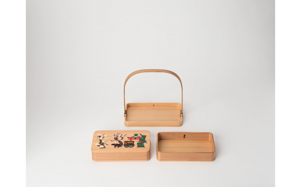 『菅原伝授手習鑑』の梅王丸、松王丸、桜丸の三つ子が神社の前で対峙する「車引」の場のイメージをベースに、福岡県の県花でもある「梅」に加えて「松」「桜」を博多曲物の絵付風にアレンジし、2段重の蓋に絵付けを行ったオリジナルの博多曲物2段重かご付です。