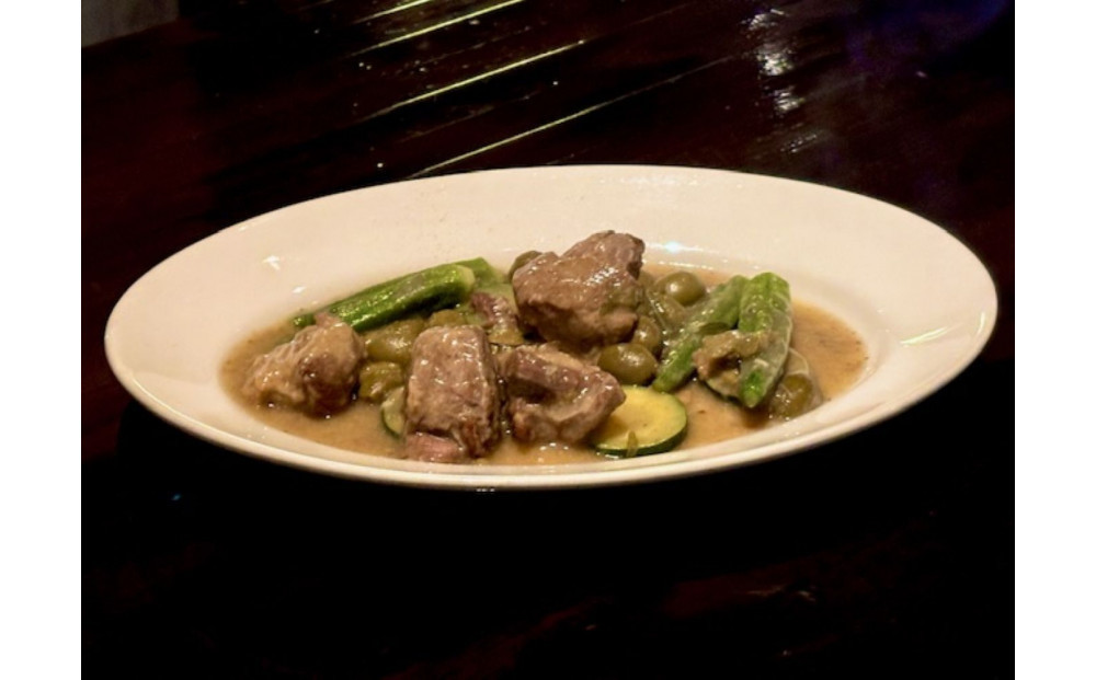 *仔羊肩肉のカッチャトーラ:マリネした仔羊肩肉を香ばしく焼き、アンチョビ、白ワイン、オリーブで煮込んだ地中海料理。
