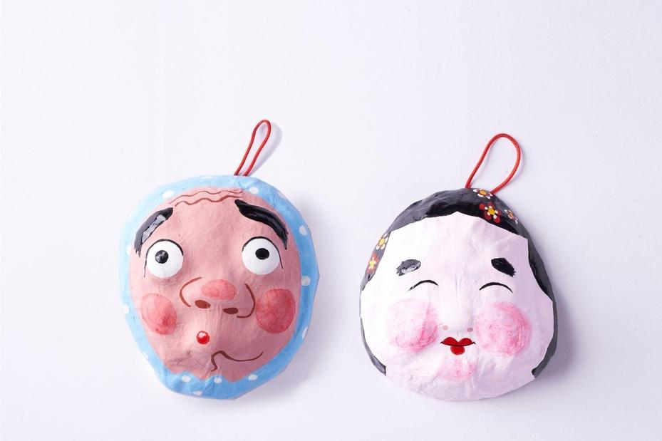 人の顔の大きさのお面をミニサイズの飾り物にしたものです。