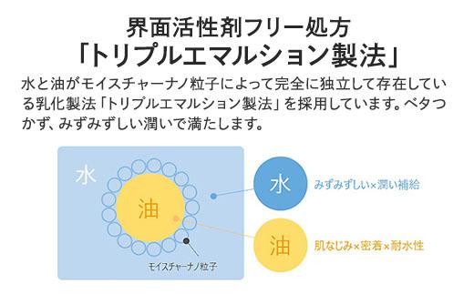 トリプルエマルション製法により、みずみずしくすーっとなじむのに、しっとりと保湿もできるテクスチャーで