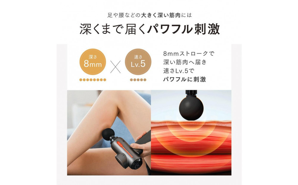 深さ(ストローク)と速さ(振動スピード)をコントロールし、首や肩の浅い筋肉から太ももやふくらはぎの深い筋肉まで、的確な振動刺激で心地よいケアが叶う、業界初のハンディガンが誕生。 従来のパワフルさはそのままに、だれが使っても、どこに使っても、変わらないフィット感と気持ちよさ。 事業者:創通メディカル 連絡先:092-260-7366 関連キーワード:美容家電 健康家電 日用品