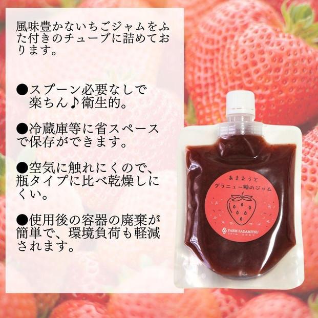 福岡県産あまおうを使用した、いちご農園手作りの美味しい果肉たっぷりのジャム。無添加製法で、使いやすいチューブパウチ入り。