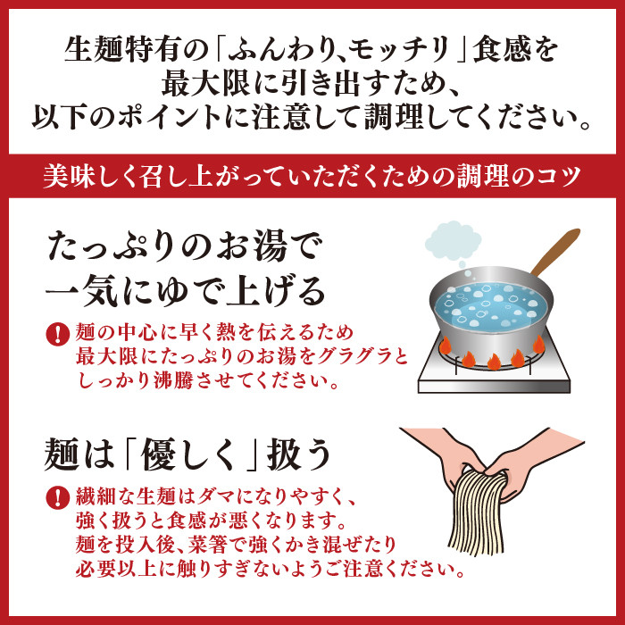 繊細な味わいの生麺とスープのバランスを崩さないように、最適な配合を実現いたしました。