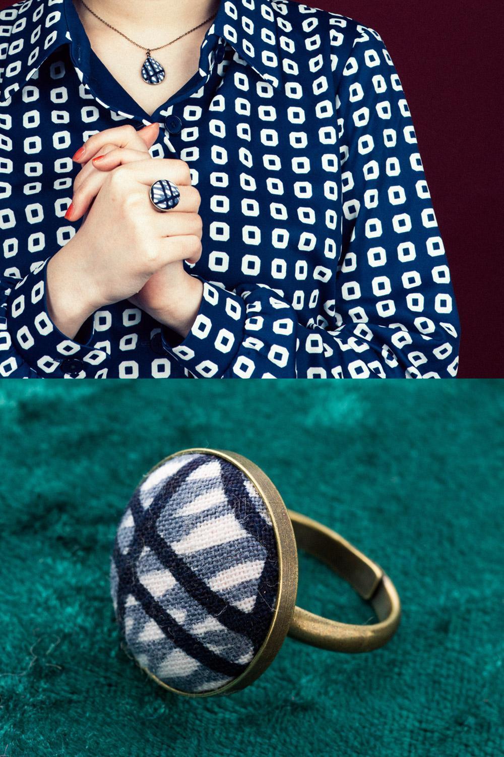昭和時代のビンテージファブリック(洋服の布)を使用し、福岡市内で作成したアクセサリー