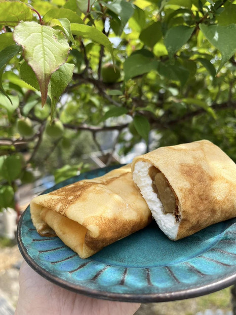 もっちり薄焼きのクレープ生地に、ねっとり甘い焼き芋ペーストと黒蜜を包みました。