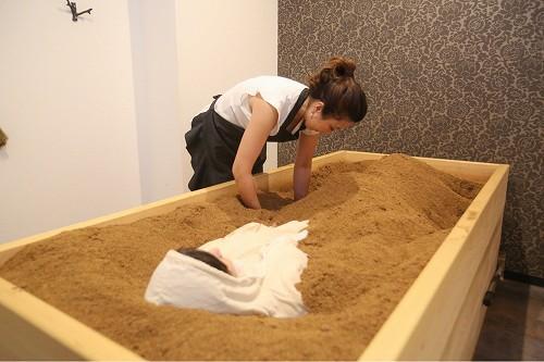 酵素風呂とは 電気やガスを使用せず、自然の発酵熱のみを利用した温浴サービスです。発酵したヒノキパウダーは70℃~80℃の熱を発生させます。空気と水分を含んだフワフワの状態で、体感温度は40℃前後に。ヒノキの良い香りに包まれながら身体の深部から温めることで、血流・リンパの流れを促し、免疫力向上にも期待できます。