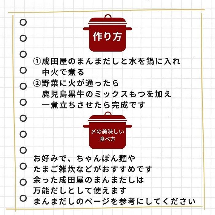 内容は成田屋のまんまだし600ml×1本と、鹿児島黒牛ミックスもつ100g×2袋のセットです。