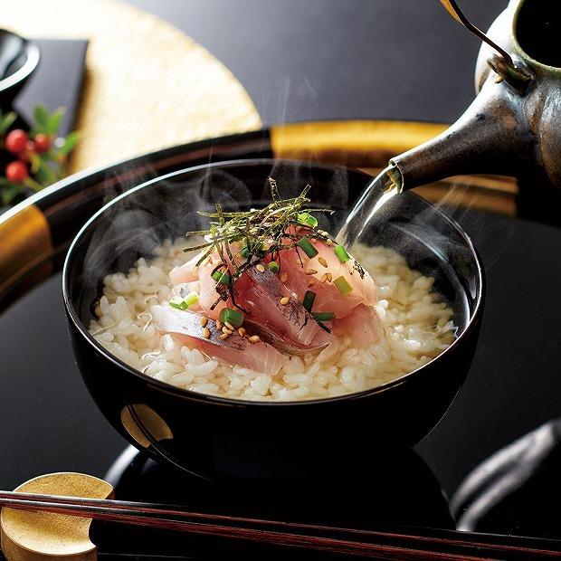 あじの皮から抽出したフィッシュゼラチンのお出汁でお刺身を包み込んだお茶漬けです。