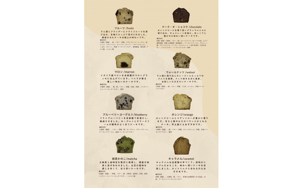 フルーツ/ケークオショコラ/ウォールナッツ/オレンジ/抹茶かのこ/キャラメル/ビューティー/ミルクティー/ブルーベリー/黒ゴママーブル/マロン/ココアマーブル/マンゴー/パイナップル/ソルト&焦がしバター