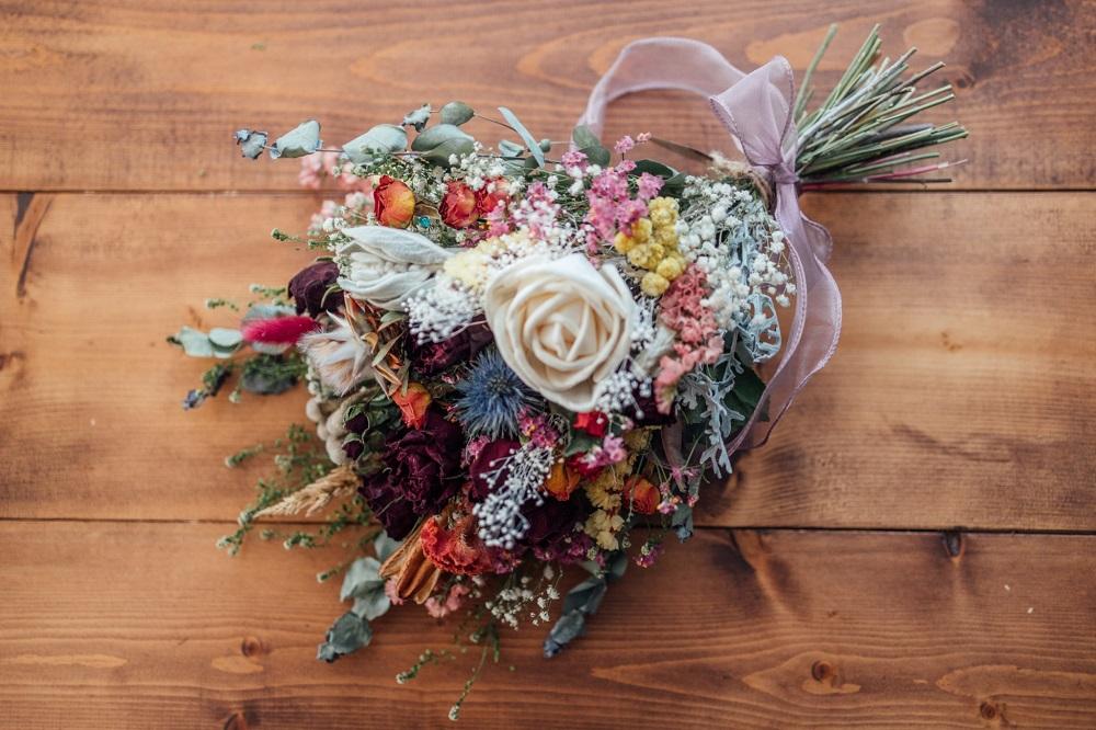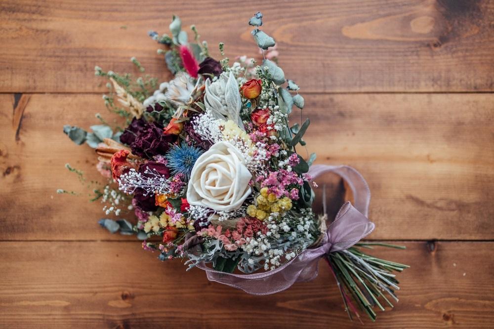 おまかせにて季節のドライフラワーとソラフラワーで豪華に束ねます