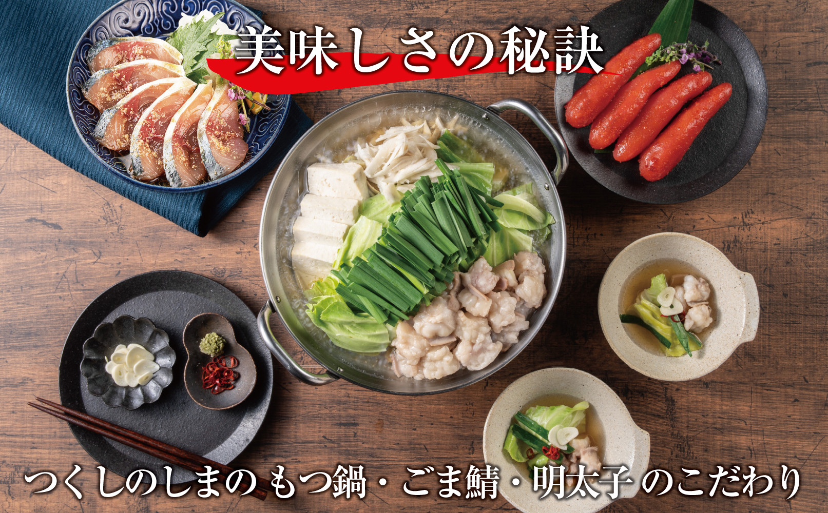 博多もつ鍋(和風だし醤油味)3〜4人前と博多ごま鯖2パックと辛子明太子4本セット