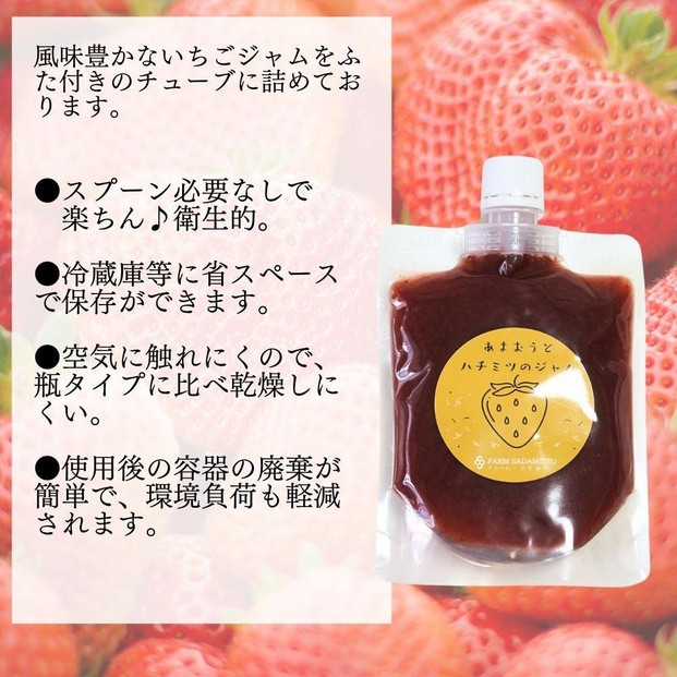 福岡県産あまおうを使用した、いちご農園手作りの美味しい果肉たっぷりのジャム。無添加製法で、使いやすいチューブパウチ入り。