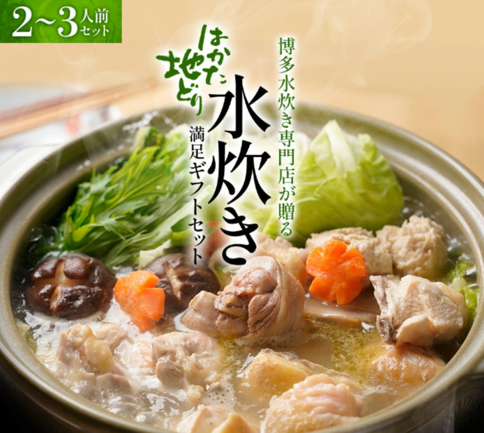 博多水炊き専門店が贈るはかた地どり水炊きセット。博多から全国へ、本場の味をご自宅で。噛むほどに増すうまみ、そしてはかた地どりならではの噛みごたえ。肉質がきめ細やかでサクッとした歯切れの良さは、水炊きを美味しくするために改良された地どりならでは。〆めは福岡が誇るラーメン専用小麦ラー麦を使った麺で、スープに溶けだした鶏のうまみを最後までお楽しみください。