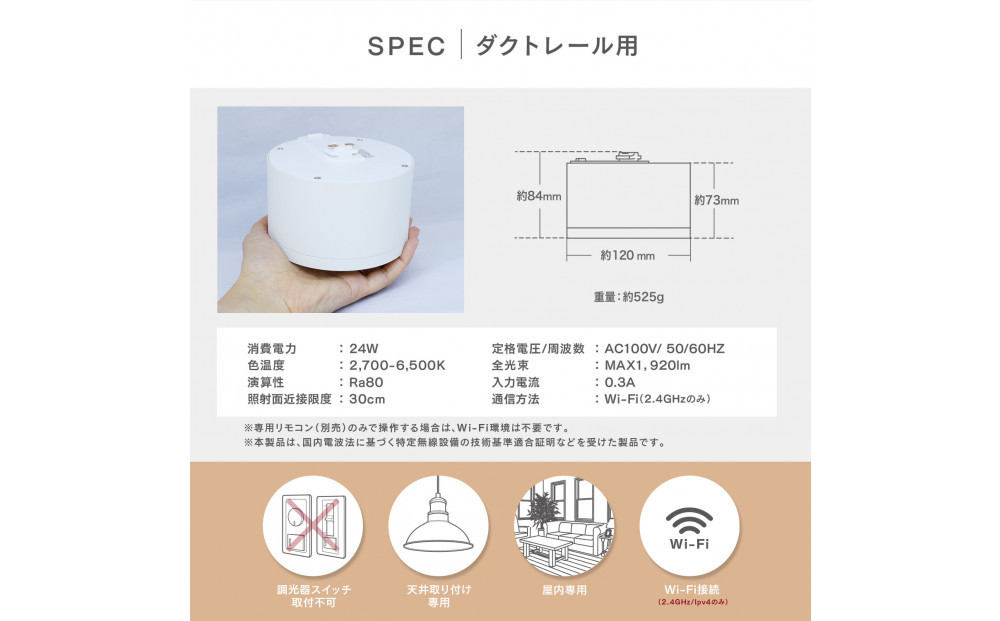 シンプルな筒形デザインのダクトレール用タイプはダウンライトのようにスッキリ見せることができ、複数使いでも圧迫感がありません。明るさは最大1,920lm。1灯なら3〜4畳ほどの明るさですが、ダクトレールに複数灯設置すれば6畳、8畳、10畳、12畳まで幅広く対応可能。シリーズのスマート電球やスポットライトとも組み合わせて使えます。省エネ性能も高く、最大明るさで24W、最小調光時はわずか3Wと節電にも効果的です。