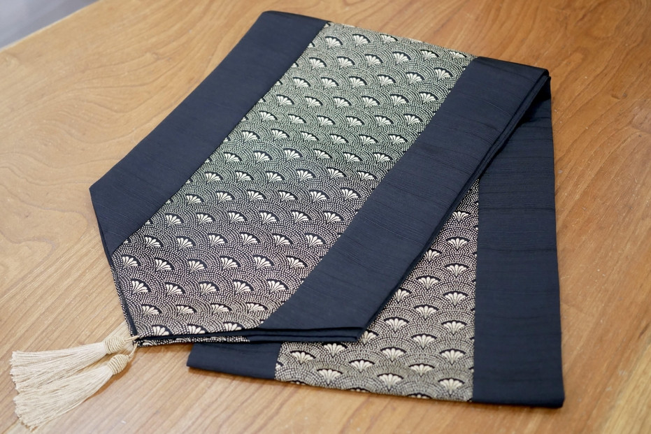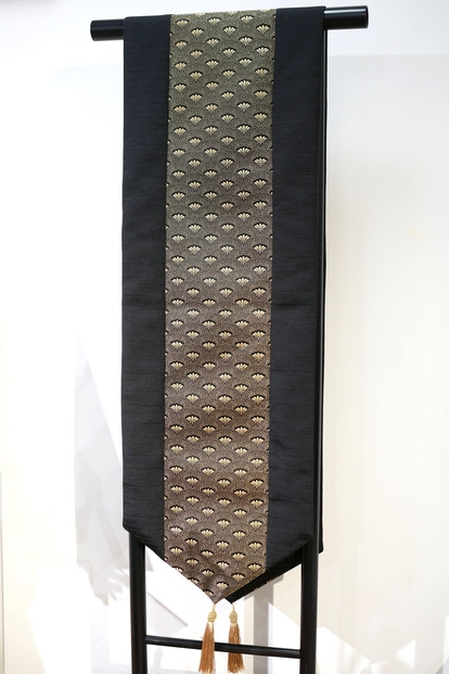 華扇(はなおうぎ)紋様は、吉祥文様の青海波に花の広がりをデザインし、金糸で立体的に織り上げた博多織で、末永い幸せを願う思いを込めております。